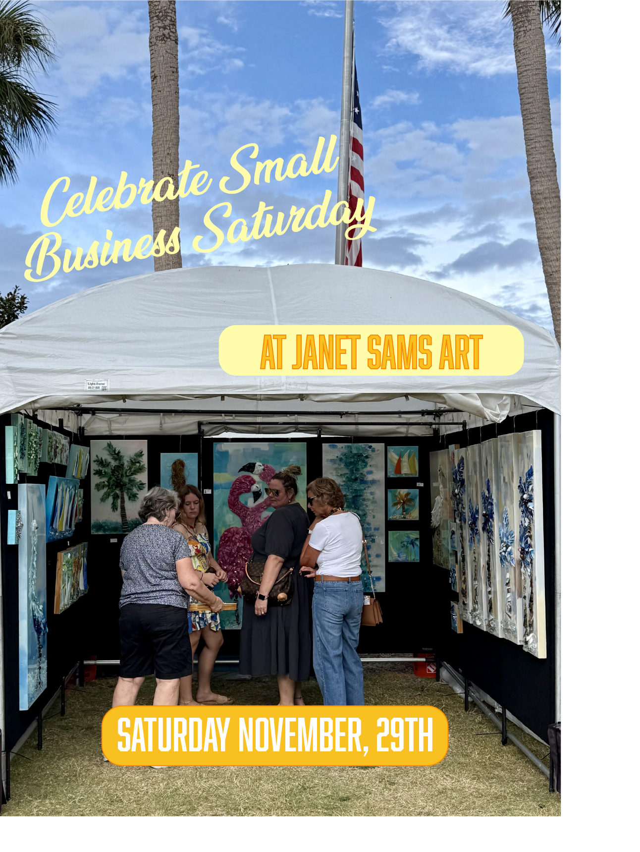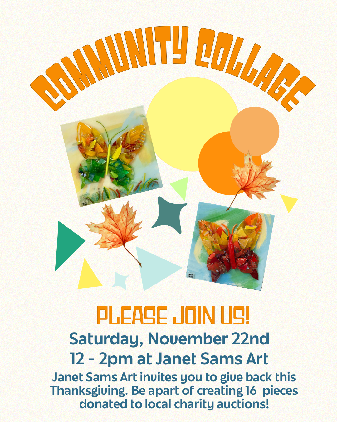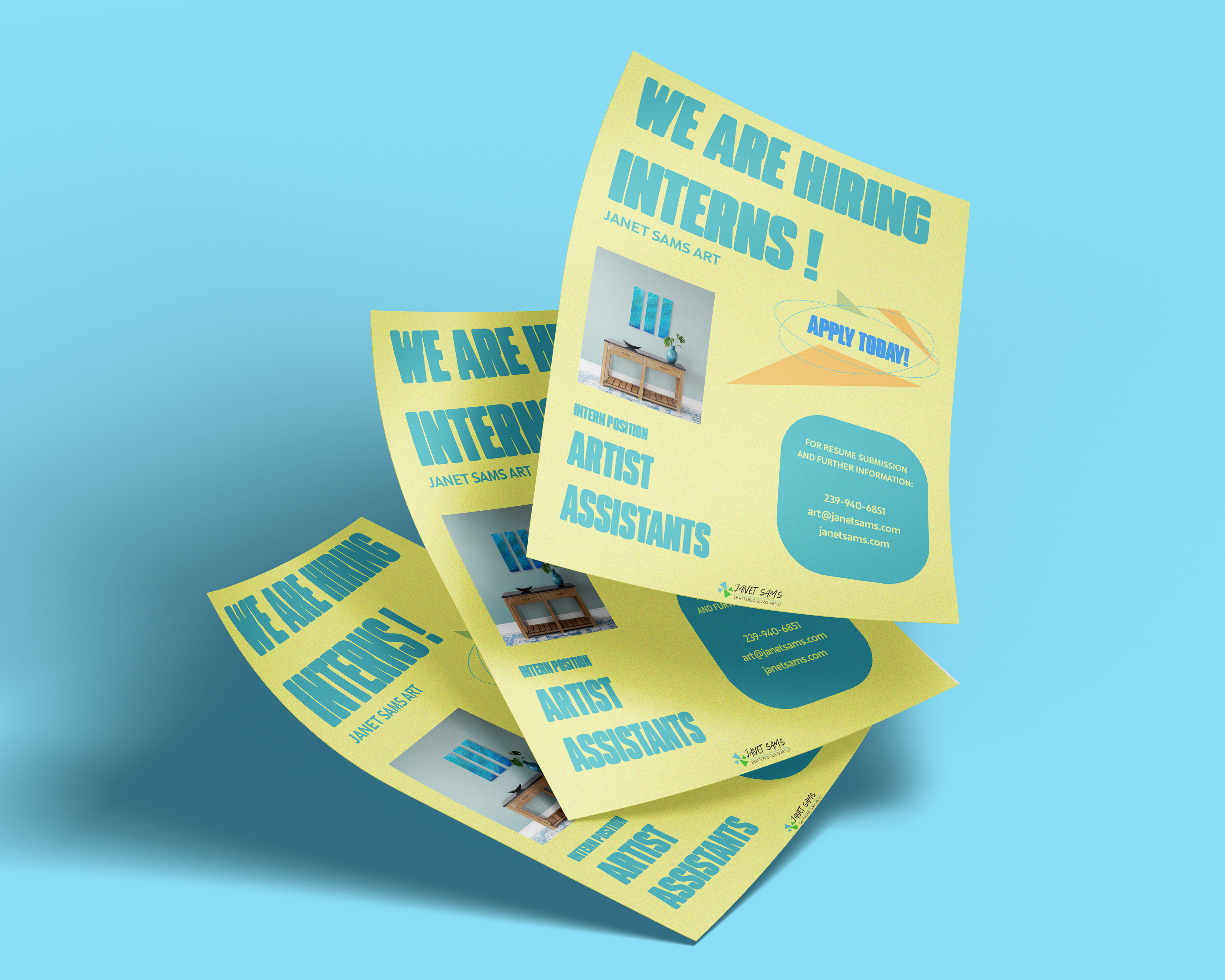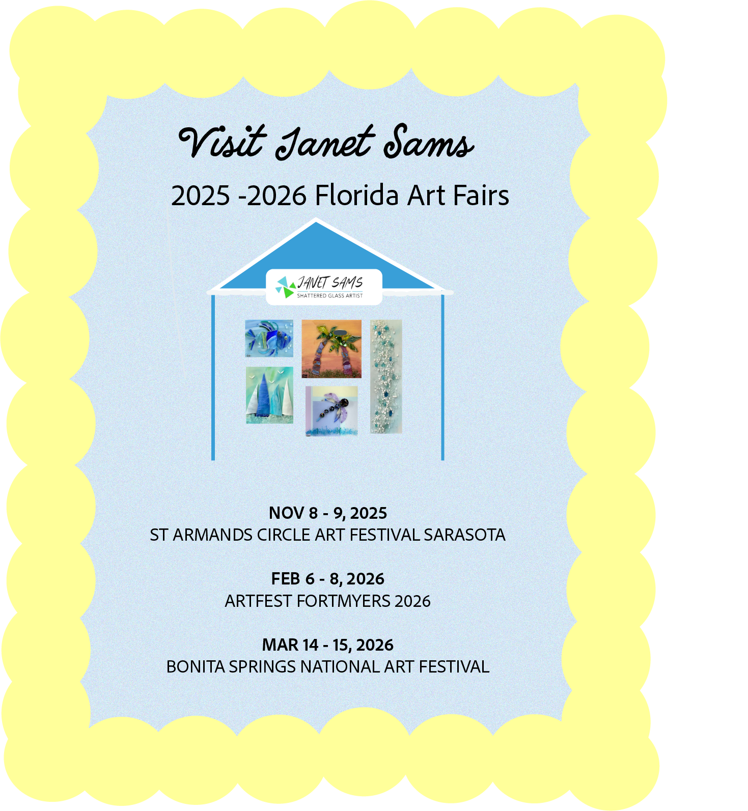 This portfolio section highlights my ongoing social media design and management work for Janet Sams Art, an art gallery and studio in Cape Coral, Florida known for its shattered glass artwork. I created consistent, branded graphics and templates for Instagram and Facebook to showcase artwork, promote events, and highlight the creative process—helping attract new buyers, increase in-studio visits, and engage both local collectors and tourists.